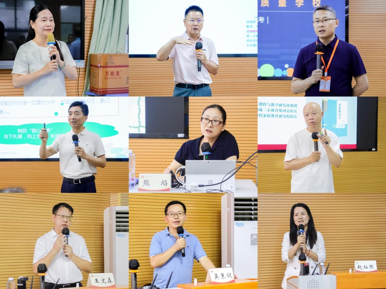 本次培训汇聚9位省内外知名专家,通过专题讲授、案例研讨等形式,重点围绕集团化办学模式、内部治理机制、质量提升策略及人工智能应用等主题展开培训。韶关市翁源县教师发展中心黄海萍老师通过有趣的团建活动,快速建立了教师学习共同体。徐廷福系统分析新时代基础教育面临的挑战及建设教育强国的重大意义。北京建华实验学校校长左鹏阐述如何办好新时代高质量中国式现代学校。深圳市第二实验学校崔学鸿教授讲授如何通过校徽文化内涵构建集团化办学治理体系。广东第二师范学院熊焰教授阐述新时代学校建设的核心命题与实施路径。华东师范大学刘良华教授从学校改革措施入手,深度解析集团化办学和学校治理策略。浙江衢州市实验学校教育集团党委书记王文森分享教育集团办学的优秀经验。韶关市教育科学研究院副院长吴秉健演示人工智能赋能教学的具体应用。广州市海珠区第二实验小学赵灿然副校长分享集团教学质量管理策略。