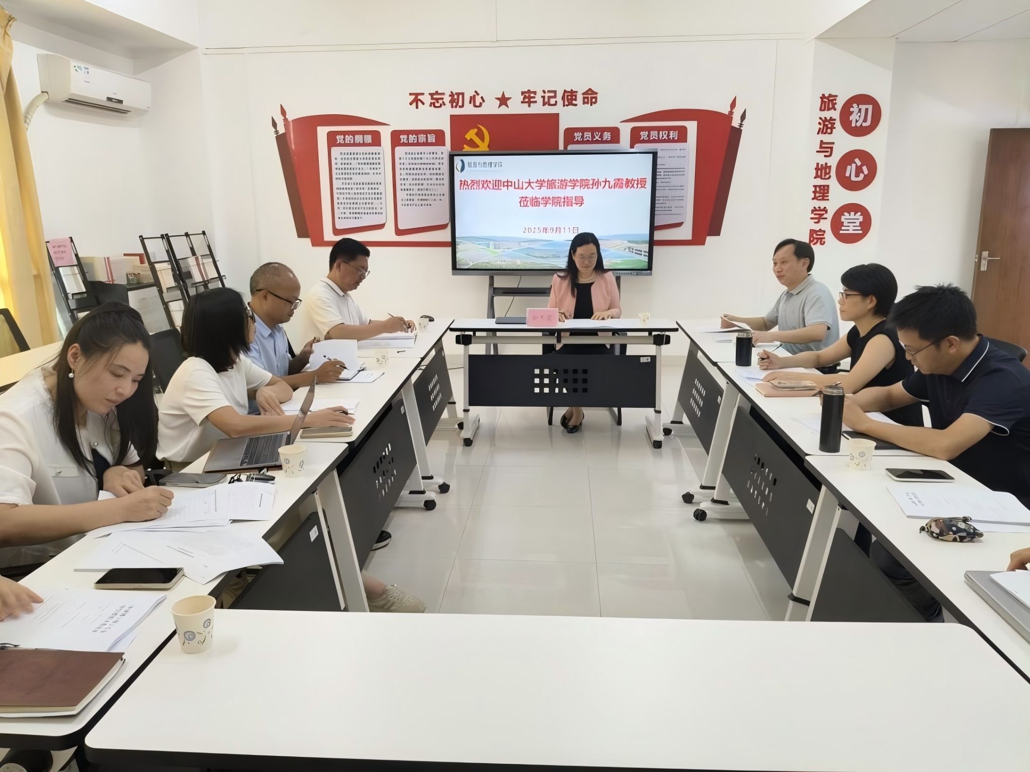 2025年9月11日下午,韶关学院旅游与地理学院特邀中山大学博士生导师、珠江学者特聘教授孙九霞来校指导旅游管理专业建设。学院党委书记曾裕华、院长李航飞、副书记肖著华、副院长罗晓莹、副院长陈世发及旅游管理专业骨干教师参加了会议。