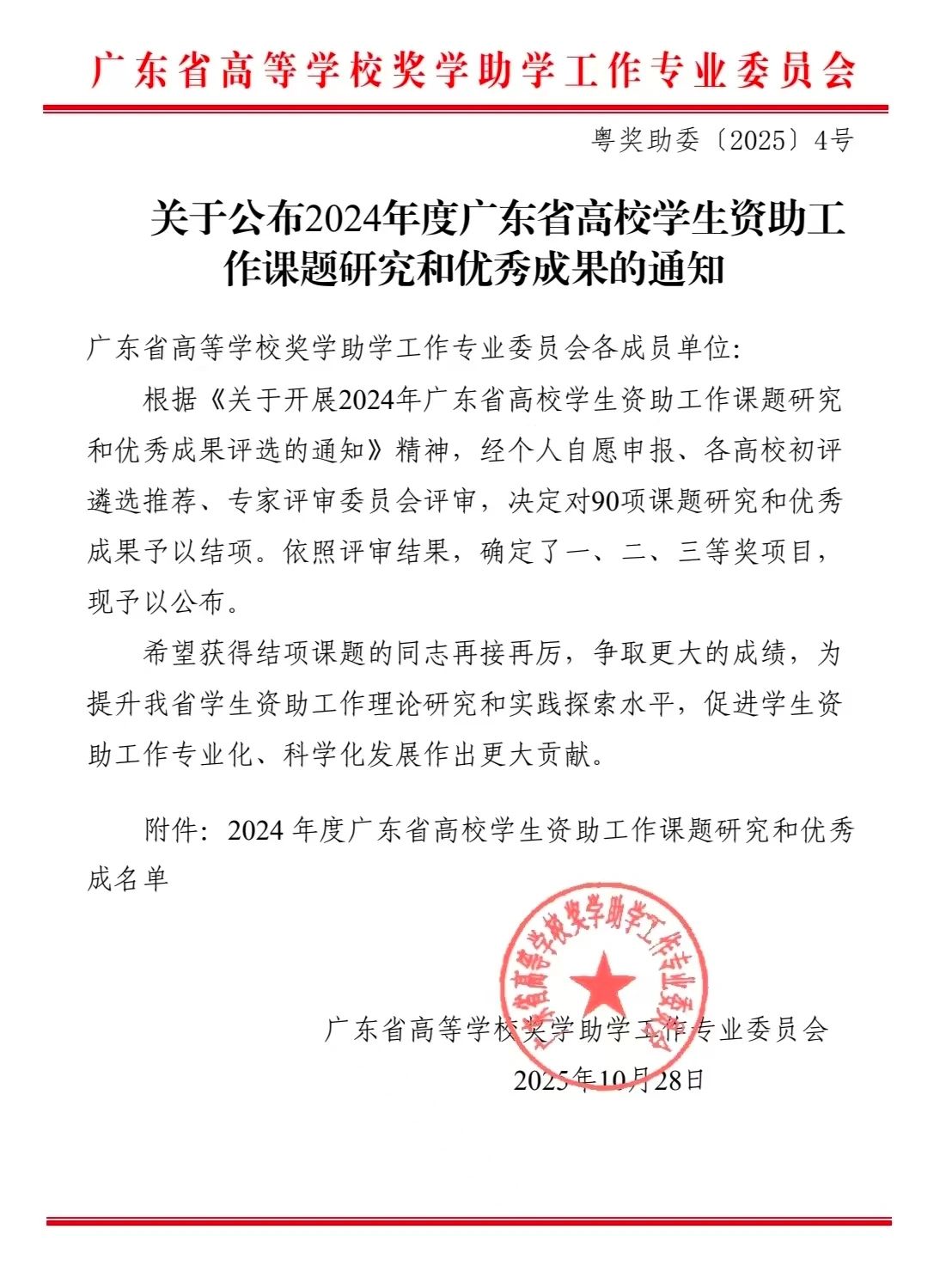 2025年10月28日,广东省高等学校奖学助学工作专业委员会公布了2024年度广东省高校学生资助工作课题研究和优秀成果评选结果,我院肖著华老师主持的《中国传统修身自强理念融入资助育人研究》项目荣获二等奖。