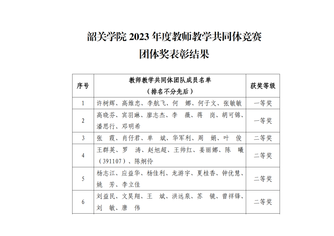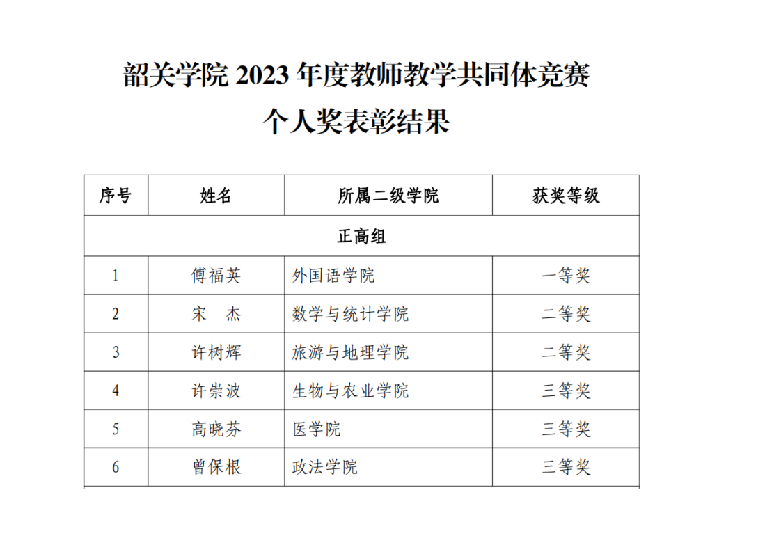 经专家评审、学校教学委员会审议、校内公示无异议,学校对正高组傅福英等 6 人、副高组李航飞等 12 人、中级及以下组胡可锦等 18 人,教师教学共同体 12 个,以及旅游与地理学院等 12 个二级学院给予表彰和奖励,奖励标准按照《韶关学院教师教学共同体竞赛实施方案》(韶学院〔2022〕66 号)执行。
