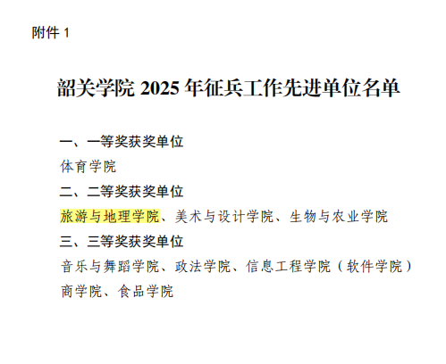 2025年11月19日,韶关学院印发《关于表彰 2025 年征兵工作先进单位和先进个人的决定》(韶院〔2025〕63 号),我院凭借在征兵工作中的扎实成效与突出贡献,荣获 “2025 年征兵工作先进单位二等奖”;我院肖著华、谢佳文、王玉珊三位同志获评 “2025 年征兵工作先进个人” 荣誉称号。