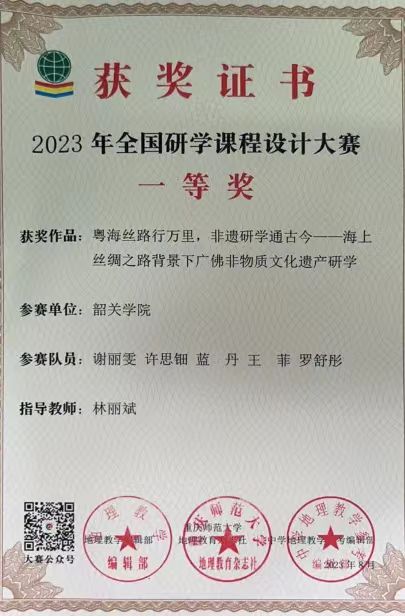 近日,由全国地理教育三刊《中学地理教学参考》《地理教学》《地理教育》组成的“九州杯”研学大赛组委会发布了“2023年全国研学课程设计大赛”线上比赛获奖名单。我校旅游与地理学院教师林丽斌指导谢丽雯等同学完成的《粤海丝路行万里,非遗研学通古今一海上丝绸之路背景下广佛非物质文化遗产研学》荣获一等奖;李航飞指导丘丽敏等同学完成的《丹山碧水:探寻丹霞奥秘,领略客家风情—广东丹霞研学实践课程设计》、全春焕等同学完成的《雨林之研:走进热带雨林,体验黎族风情—基于海南热带雨林国家公园元宇宙营地研学旅行课程设计》荣获二等奖。