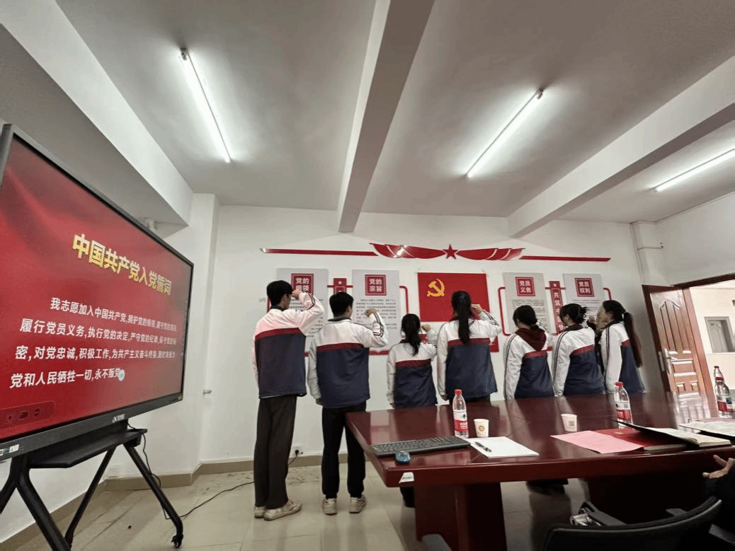 活动第四环节“预备党员党徽授予仪式”。在鲜艳的党旗前,谢俊才为预备党员逐一授戴党徽。全体党员面向党旗,重温了入党誓词。铿锵有力的誓言回荡在活动室中,进一步强化了党员的身份意识与责任担当,也激发了在场团员青年向组织靠拢的决心。