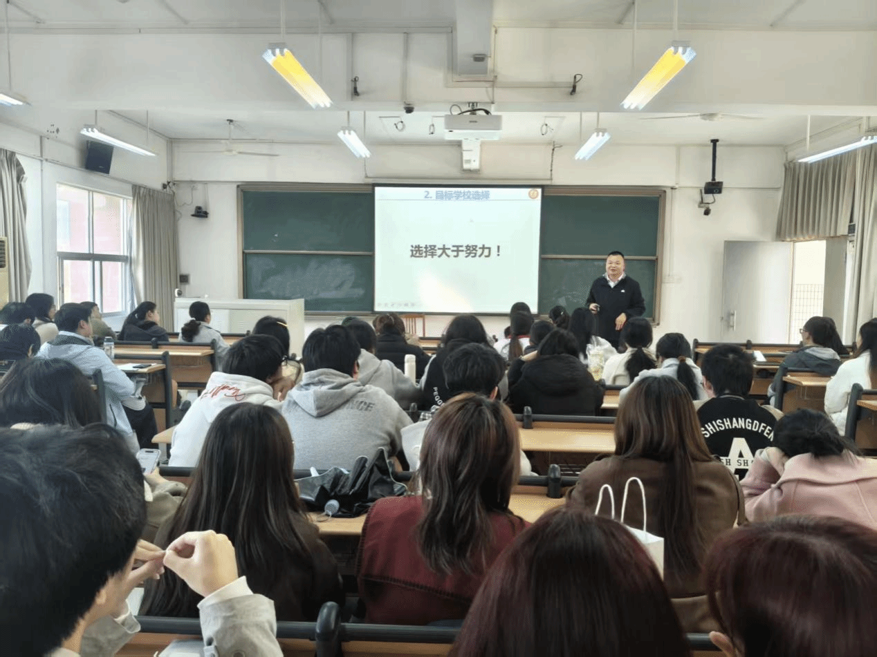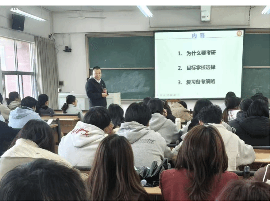 随后,杨林作为主讲人,为同学们带来了一场全面且实用的考研指导。他从“为什么要考研”“目标学校选择”“复习备考策略”三个核心部分展开详细讲解,为同学们拨开考研路上的迷雾。