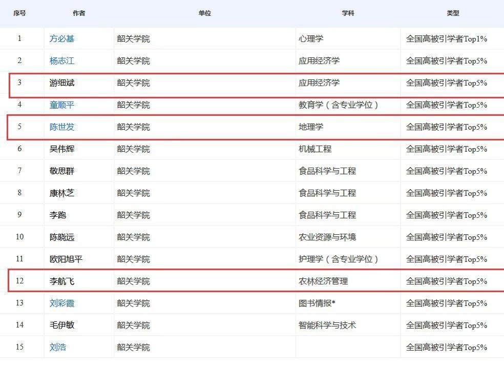 近日,中国知网·中国科学文献计量评价研究中心公布《2025全国高被引学者》名单,韶关学院有1位教师进入TOP1%,14位教师进入TOP5%名单,其中旅游与地理学院游细斌、陈世发、李航飞进入“全国高被引学者TOP5%”行列,是全校进入该名单人数最多的学院(并列第一),彰显了我院学科建设成效和教师研究水平,也凸显了学术影响力。陈世发也是我校2024年进入中国知网首次发布的“中国知网高被引学者”名单的七位教师之一。