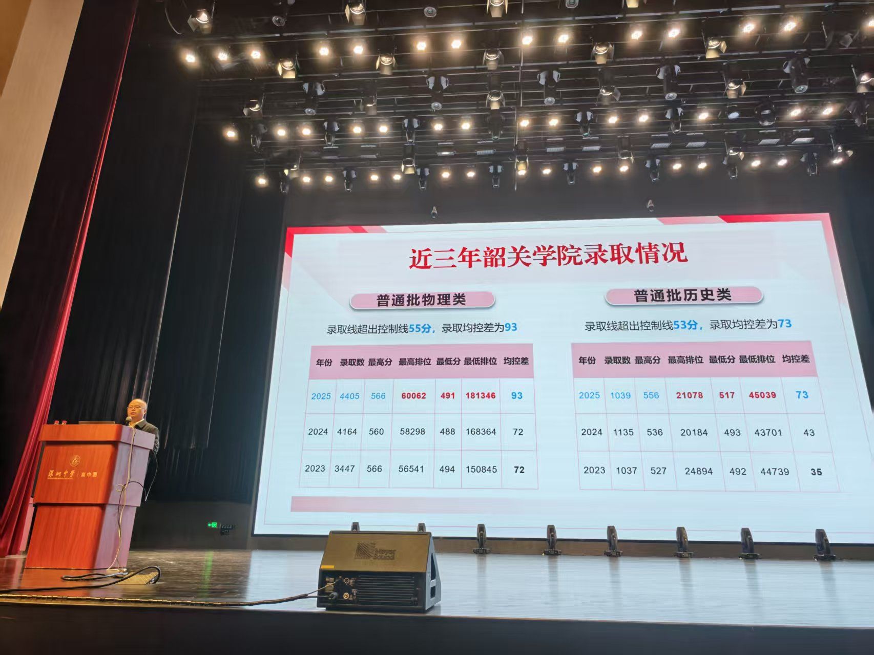 随后,肖著华上台宣讲,围绕韶关学院的办学底蕴、学科建设、人才培养模式等内容展开讲解,重点梳理了学校各类招生政策与报考要点,结合学院特色专业优势,向在场学子发出报考邀请,让大家对韶关学院有了更直观、全面的认知。深圳中学高中园300多名师生及家长参加了宣讲活动。