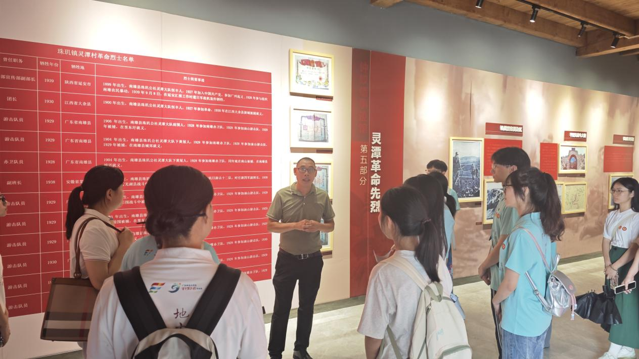 在珠玑镇灵潭村,实践队与当地村委干部和村民群众座谈,村干部邓功平带领大家参观钟蛟蟠事迹陈列馆等,深情讲述了钟蛟蟠烈士的英雄事迹。秀水灵潭,红色热土,孕育出了一大批英雄儿女,他们为革命事业拼搏奋斗,乃至献出生命,钟蛟蟠就是其中优秀的代表。实践队员们还考察了该村农业文化遗产水旱轮作灌溉系统、古驿道、古榕树、乡村民宿等旅游资源。