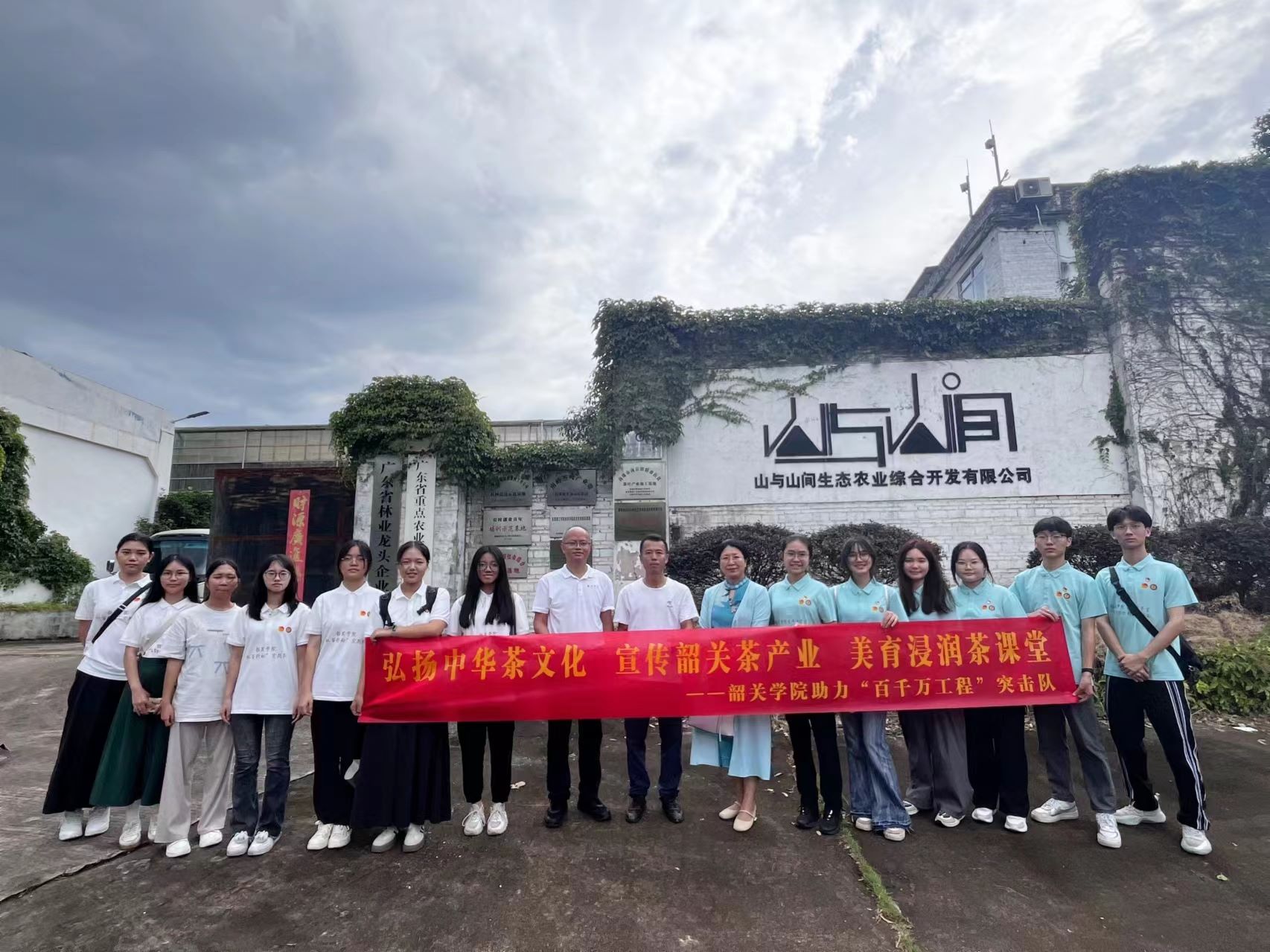 韶关茶产业基础扎实,六大茶类齐全,全市茶叶种植面积达9万亩,综合产值超10亿元。近两年来,韶关全力统筹做好茶文化、茶产业、茶科技大文章,推动茶产业高质量发展,主攻茶产业等“十业千亿”农业全产业链培育工程。实践团第三站便来到位于南亩镇的广东省农业龙头企业、山与山间生态农业公司调研茶叶生产、制茶工艺、品牌打造、茶叶包装与销售情况。在茶厂负责人的带领下,师生们参观了现代化的茶叶生产车间和产品展销馆,还前往茶园实地考察,调查研究茶园的经营现状及运营模式。据悉,山与山间公司专注于原生态茶叶种植、茶叶生产加工和茶叶市场营销,其主要产品是“吾小茶”“山与山间”系列红茶、绿茶、白茶等10多个品种,公司的南亩茶谷3000亩生态茶园,是粤北最大连片茶叶种植基地。
