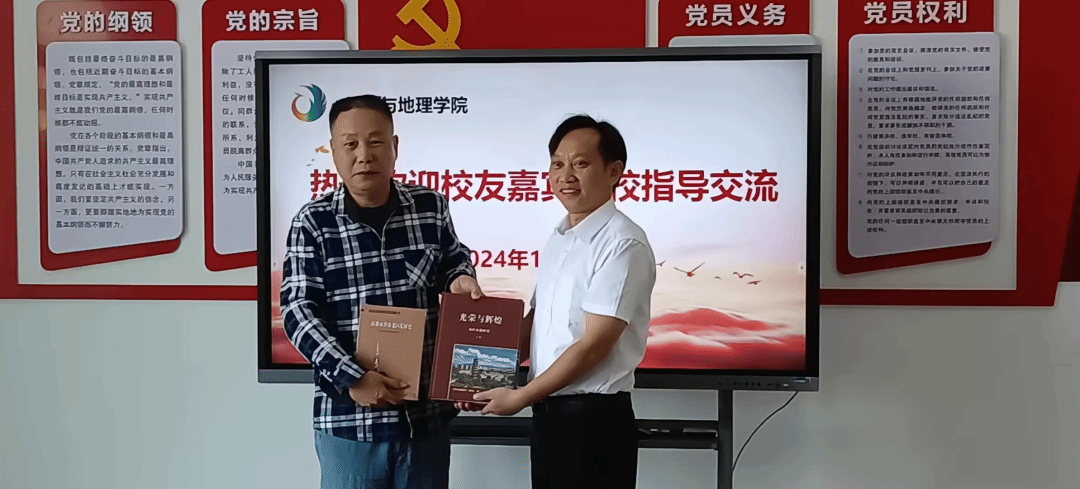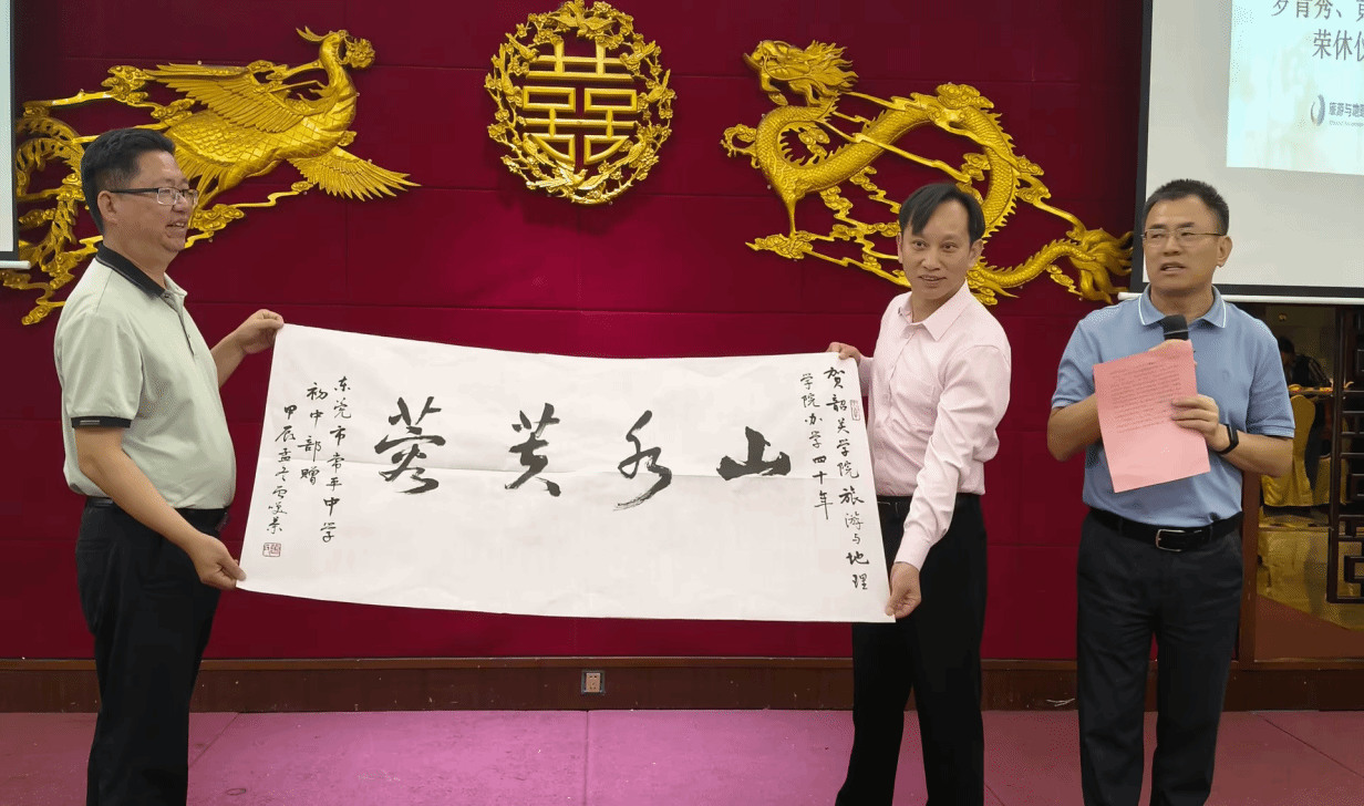 活动中,1987级、1989届地理教育专业陈水勤校友向学院赠送了其本人主持编写的书籍《南雄市革命老区发展史》《光荣与辉煌-苏区南雄图集》,古松校友向学院赠送了《山水芙蓉》书法作品;2023届旅游管理(3+2)专业校友沈葆恒向学院赠送了一批其公司产品供教职工活动使用。