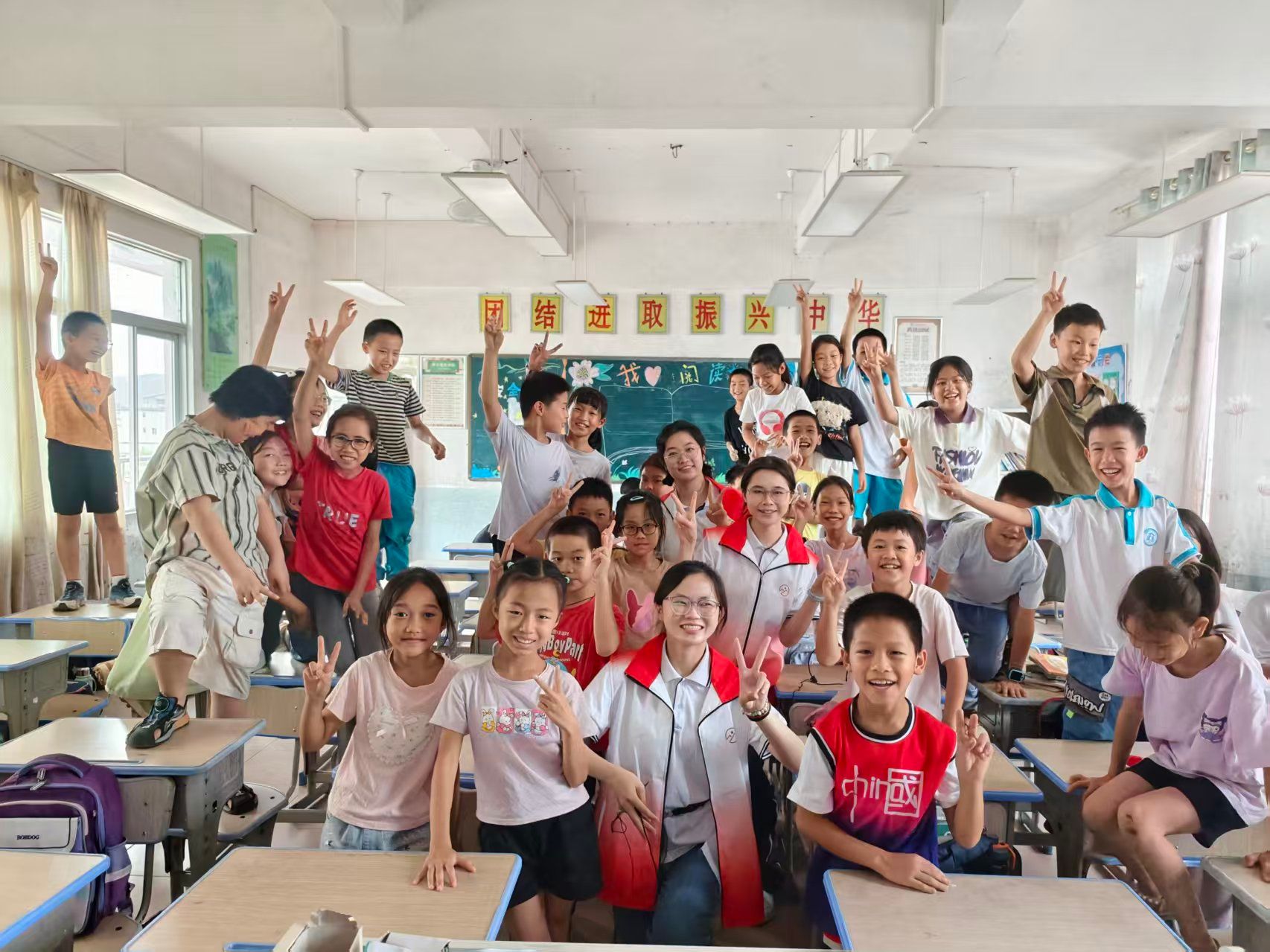 课程尾声,旅游与地理学院义教队与珠玑小学学生在教室中欢乐合影,孩子们或高举“耶”的手势,或绽放纯真笑容,与同学们一同定格下这趟地理科普之旅的温暖瞬间,画面里满是知识传递后的喜悦与师生间的真挚情谊。