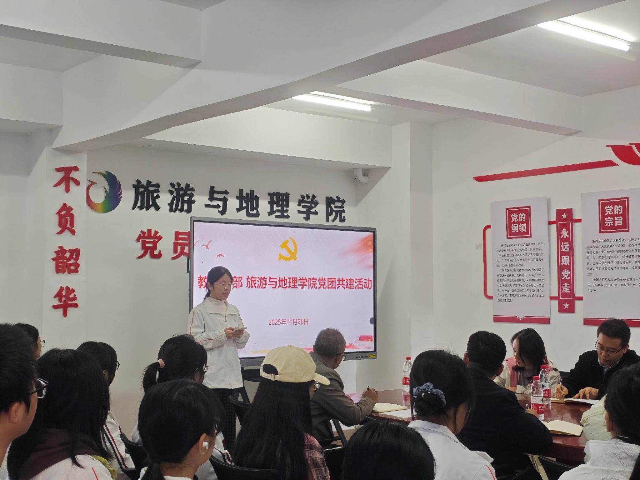 教育学部党支部和对接的团支部、社团成员、及旅游与地理学院教师党员代表、学生第二党支部在紫荆苑2楼旅游与地理学院党员活动室开展师生座谈会。2025级地理科学1班团支部、义教队负责人分别介绍了班级建设和社团建设的基本情况。教育学部相关负责人立足学校人才培养整体目标,对班团组织建设、社团发展做出了方向性指导,并对师范专业学生如何提升专业素养提出了针对性建议。现场交流氛围热烈。旅游与地理学院党委书记曾裕华对教育学部表示衷心感谢,他要求班级、社团、学生党支部在教育学部的关心和指导下,不断加强干部队伍建设,增强组织凝聚力,提升成员素质能力,形成团结向上、刻苦努力的良好学风,打造亮点突出的工作品牌。