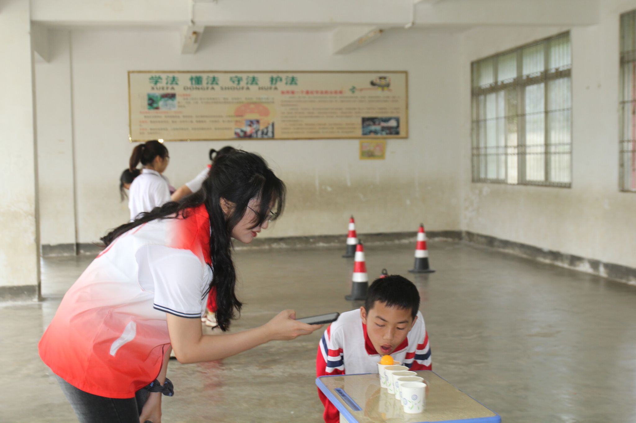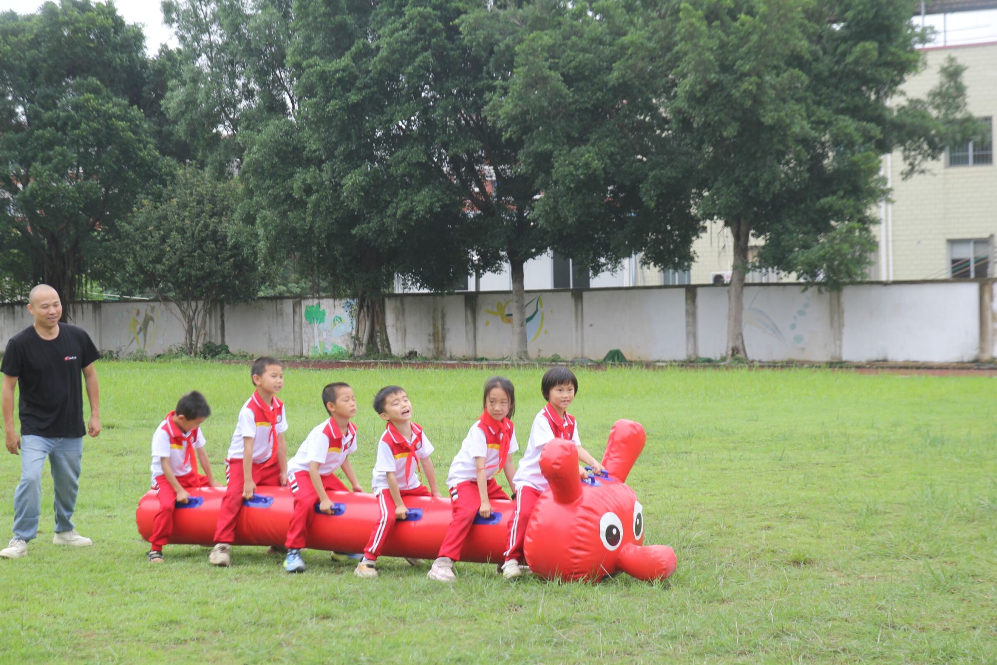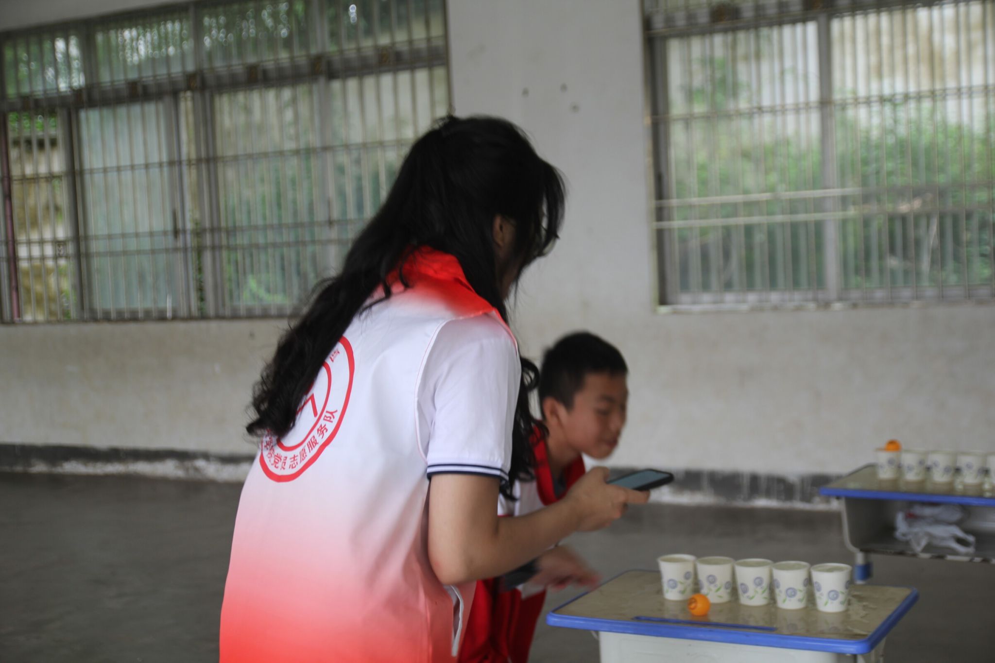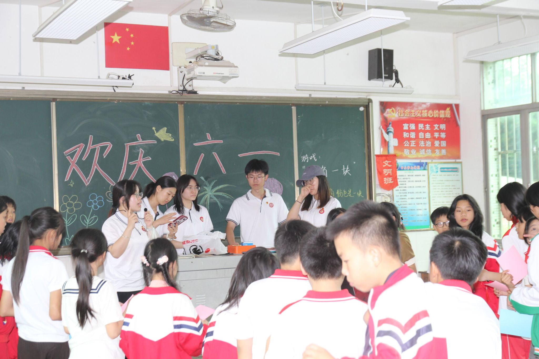 本次活动分为学生节目展演和游园活动。在展演环节,队员们担任志愿者协助节目演出。在游园活动环节,分为室内和室外两组,完成同舟共济、吹乒乓球、两人背靠背运篮球、三人绳子提杯子等各类游园小游戏,在这过程中党员同志和义教队队员团结协作,负责主持、维护秩序等工作。最终,学生们在游戏中收获了快乐,也体会到了团结、奋斗的魅力。在最后的闭幕颁奖仪式中,党员同志和义教队队员给获奖的学生们进行颁奖及合影留念,让府管小学的学生们留下了美好的记忆。