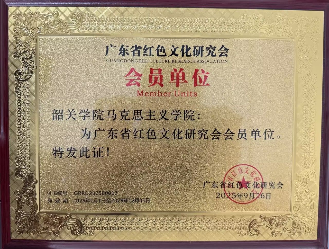 近日,韶关学院马克思主义学院正式成为广东省红色文化研究会(以下简称“红会”)会员单位。这一里程碑式进展,标志着我院在马克思主义理论教育、红色文化传承领域迈入协同发展新阶段,为广东省红色资源保护与活化注入“马院智慧”。站在新的起点上,我院将以此次入会为契机,立足粤北红色热土,深化与红会的战略合作,铸就学科新优势。