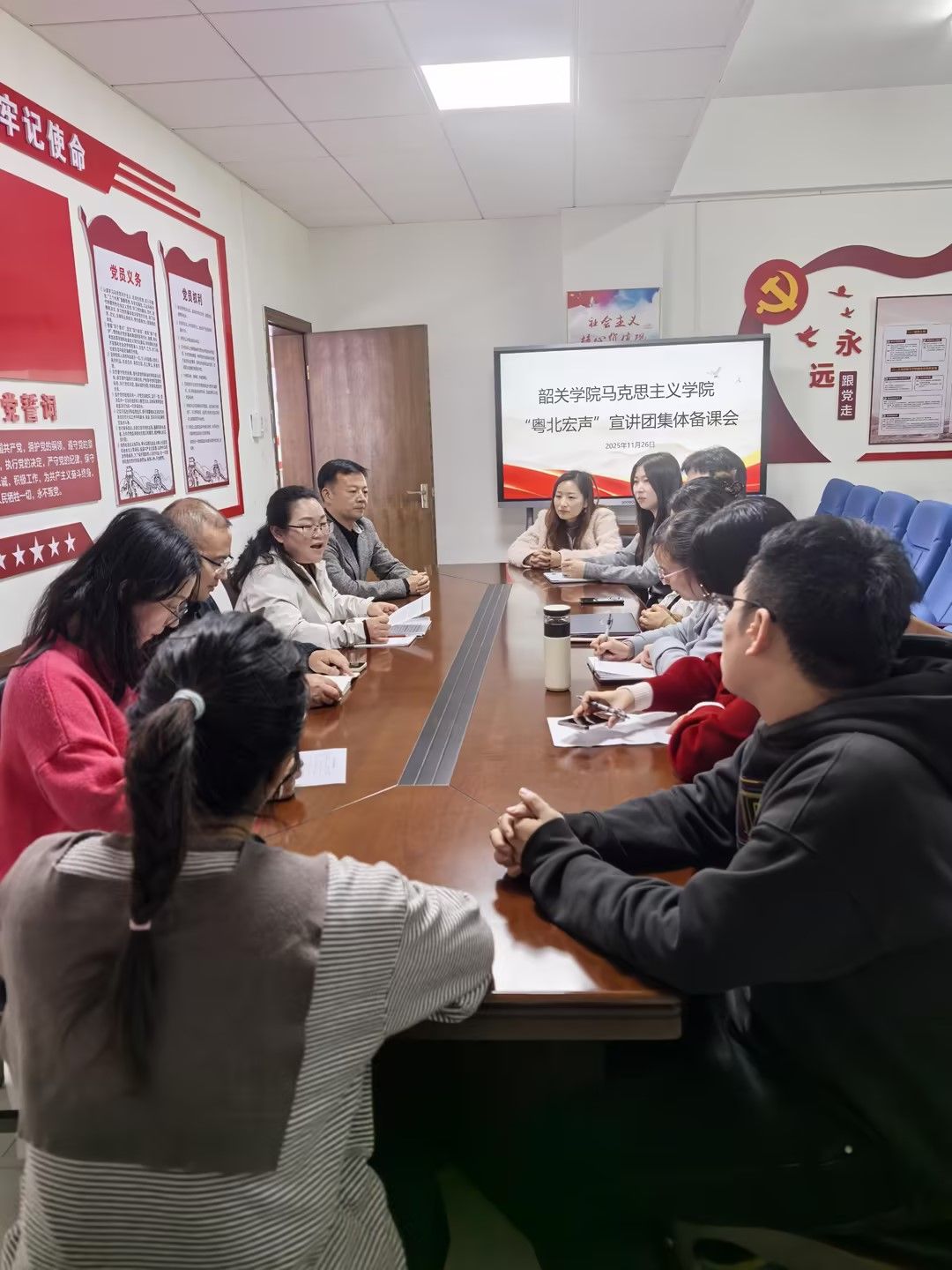 2025年11月26日,韶关学院马克思主义学院“粤北宏声”宣讲团在学院会议室召开党的二十届四中全会精神宣讲专题集体备课会,宣讲团全体成员参会。此次集体备课会以集体研讨、精准打磨为核心方式,旨在构建高质量宣讲体系,为后续深入粤北基层开展理论宣讲筑牢坚实基础。