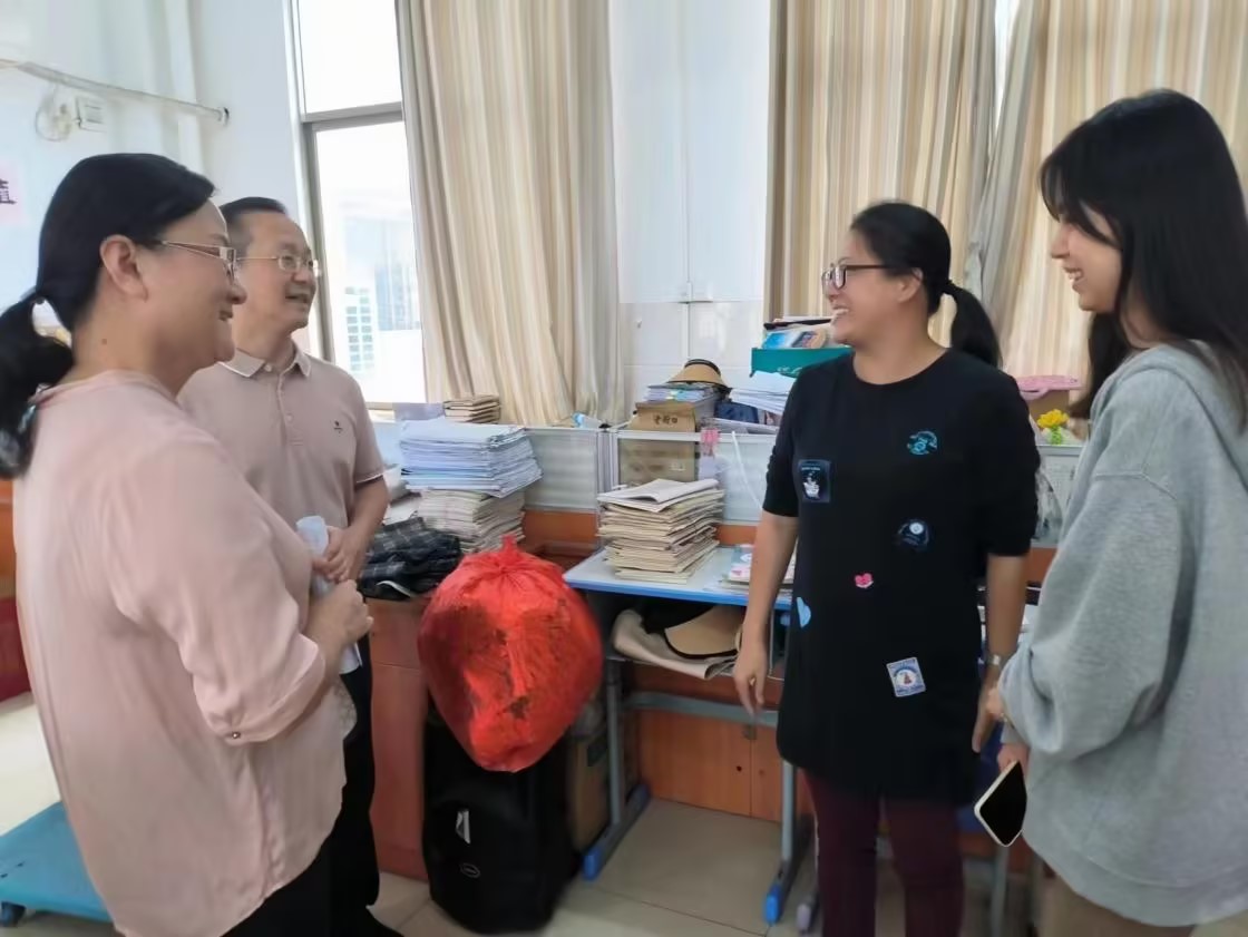 在韶关实验中学,我院老师首先参观了校园环境,走访了实习生办公场所,了解实习生的住宿及备课条件,并与实习生进行了深入交流,详细询问了实习生学习、工作、生活等方面的情况,勉励实习生要不怕辛苦,努力工作,争取圆满完成实习任务。
