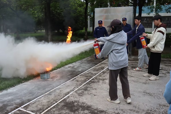 保卫部老师向大家详细讲解和演示灭火器的使用方法,同时邀请学生对灭火器的使用进行现场实操。实操后,保卫部老师给同学们分发消防安全宣传手册并合影留念。