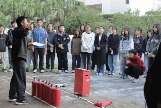 疏散完成后,保卫处的负责老师为同学们详细讲解了消防应急照明灯、疏散指示灯、灭火器、消防水带等消防器材的使用方法和检查方式。通过生动的演示和讲解,同学们对各类消防器材有了更深入的了解。随后,在老师的带领下,同学们还亲自参与了灭火器的实操体验,学会了如何正确使用灭火器扑灭初期火灾。