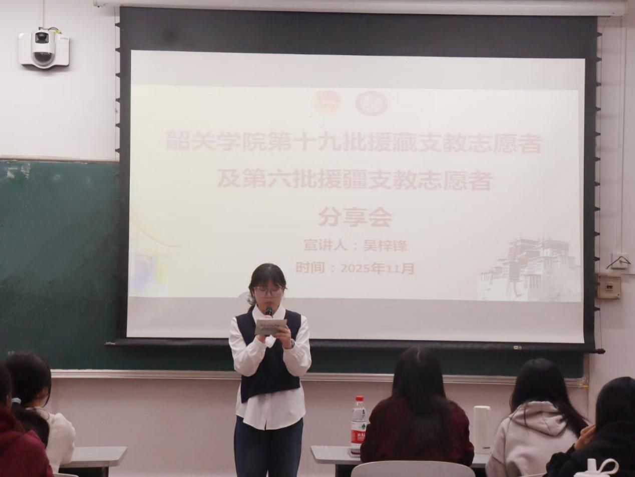 宣讲会邀请了韶关学院第六批援疆支教志愿者、2022级历史学01班吴梓锋同学担任宣讲人,2024级、2025级学生代表到场参会。