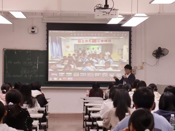 在分享会上,吴梓锋以真挚而朴实的语言,分享了扎根新疆的成长收获与暖心故事。他向同学们介绍了学校第六批援疆支教团的分布情况、服务内容、政策支持等,并分享了他们如何适应环境、克服困难,将所学知识应用于实际教学,在服务边疆中升华理想信念的故事。此外,他还介绍了支教所在地——图木舒克市的区位交通、经济文化、乡土人情等,并以大量图片、视频向同学们展示边疆教育发展的动人场景。他表示这段跨越山海的援疆路,是他人生经历中的一场温柔蜕变。他曾有跨科教学的迷茫、风沙里的思乡,但学生眼里对知识的渴望、沙枣树扎根戈壁的韧劲,让他明白青春要在祖国最需要的地方才更清晰。