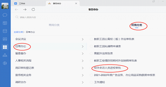 二、在所有分类中选择日常办公、校外来访人员进校审批并填报来访人员相关信息等。