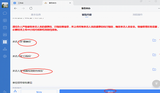 一、填报所有来访人员相关信息,包括健康码、行程卡和核酸阴性报告(严格按校外来访人员应遵循的防疫要求进行核酸检测),如果来访人数多,可以上传附件的形式进行,经部门主要负责人审批后方可入校。