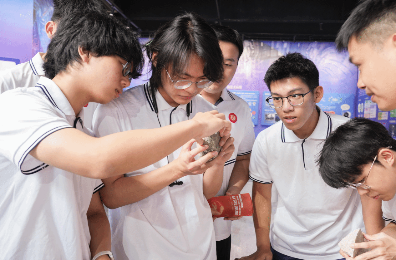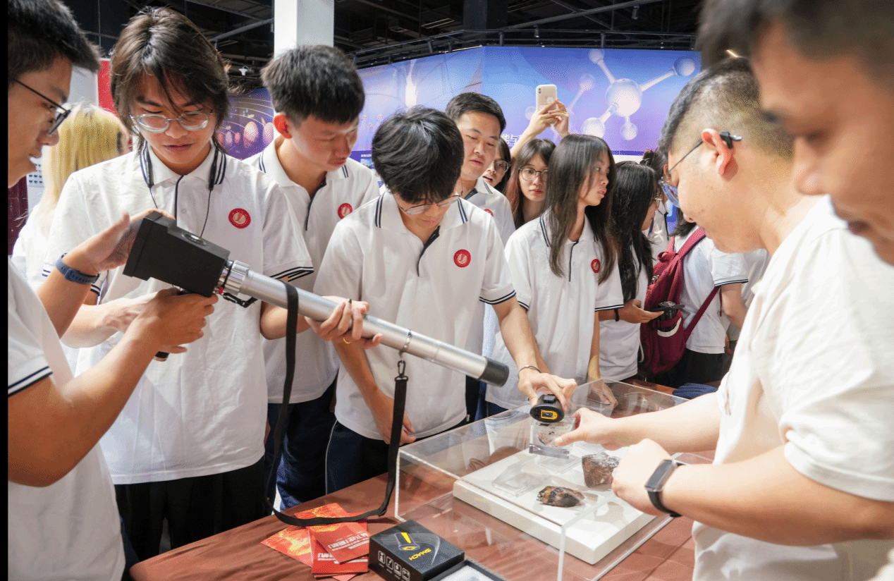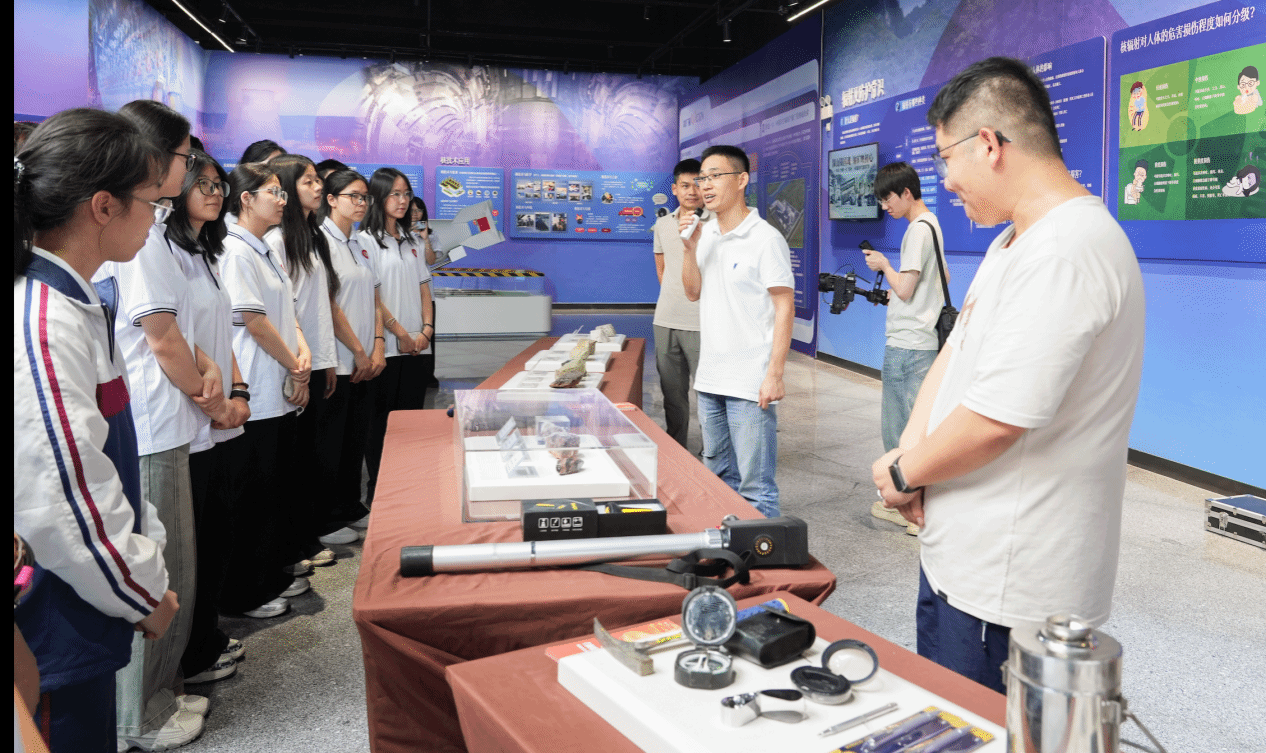基地李莹主任站在土法炼铀生产线遗址前,将三个“全国第一”的发现历程娓娓道来——从铀矿勘探的艰难起步,到土法炼铀的智慧创造,学生们仿佛听到了六十多年前石碾吱呀转动的声音。自然资源部华南花岗岩型铀矿野外科学观测研究站团队带来了一场深度互动:他们展示了多种专业仪器,结合实物矿石标本,详细讲解了当年地质队员如何在深山密林中寻找铀矿的科学原理。团队特意邀请地质专业学生参与互动,让书本知识与实地勘探相互印证。
