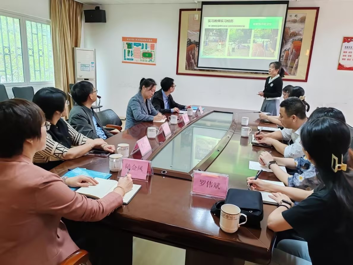 随后,马克思主义学院领导及全体实习生前往八中办公楼会议室,与八中领导进行了座谈。在座谈会上,实习生代表罗嘉欣首先作了实习工作的情况汇报,她回顾和总结了过去一个多月的实习经历和心得体会。随后,第八中学校长杨庆元发表了讲话,并重点介绍了与各级各类学校以及社会各界,包括韶关学院在内的合作情况,特别是支持高校开展实践教学工作的情况。最后,周泽雄、薛晓芳分别作了发言,感谢八中在教育实习和教育见习工作中给予的大力支持,并对今后进一步加强双方在实践教学方面的合作提出了期望。