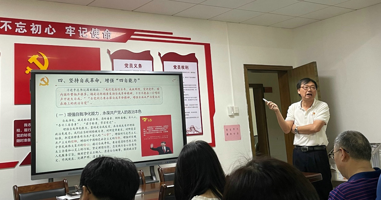 党课上,周泽雄首先以“历史周期率”之问为切入点,从毛泽东与黄炎培的“窑洞对”到习近平总书记破解历史周期率的深刻论述,点明“自我革命”是破解历史周期率的一把“钥匙”,并从党的优良传统、宝贵经验、应对风险挑战的能力等维度结合历史事实阐明勇于自我革命是我们党最鲜明的品格。随后,周泽雄带领大家深入学习习近平总书记在十九届中央纪委六次全会上的重要讲话精神,深刻领会党自我革命的丰富内涵和实践要求,并要求老师们坚持自我革命,增强自我净化、自我完善、自我革新、自我提高的“四自能力”。