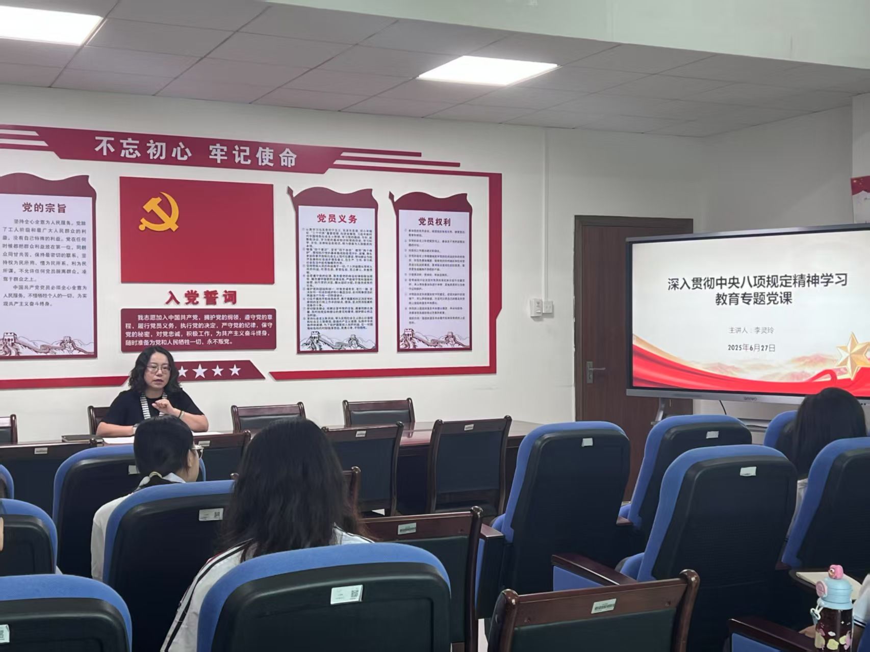 6月28日上午,马克思主义学院党委副书记李灵玲以“深入贯彻中央八项规定精神学习教育”为主题,为学生党员带来一堂内涵深刻、贴合实际的专题党课,为青年党员的思想建设注入强劲动力。