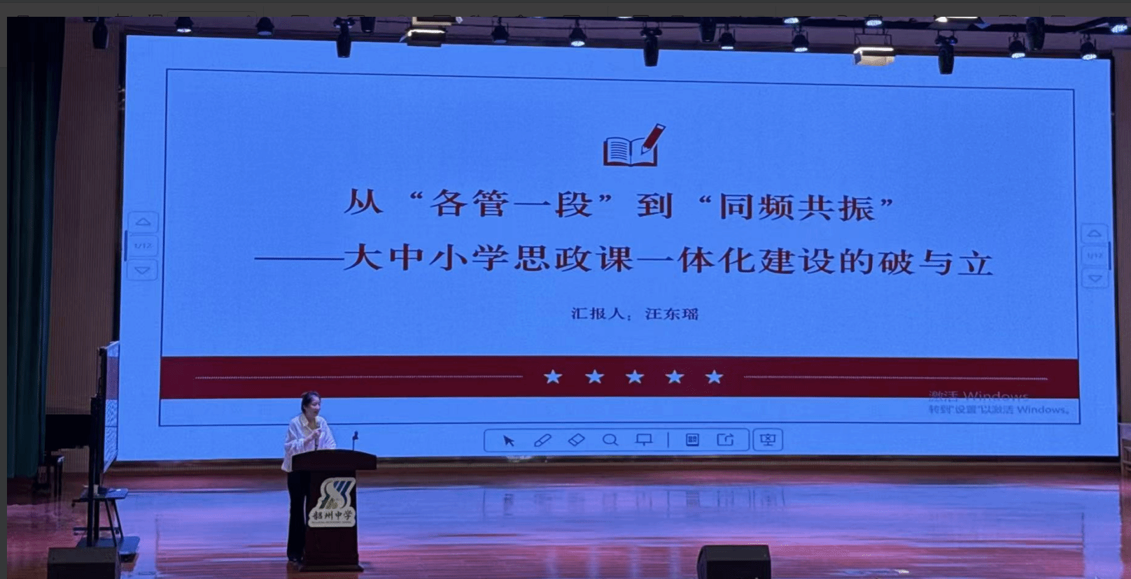 在微讲座环节,汪东瑶老师还作了题为《从“各管一段”到“同频共振”:大中小学思政课一体化建设的破与立》的专题发言。讲座紧密结合现场展示的小学、中学课例,分析了当前思政课教学中可能存在的学段隔离、学科隔离等问题,并提出了以“系统观”实现有序衔接、以“生长观”关注精神进阶、以“协同观”构建育人合力的“破立”之道,为推进一体化建设提供了借鉴。