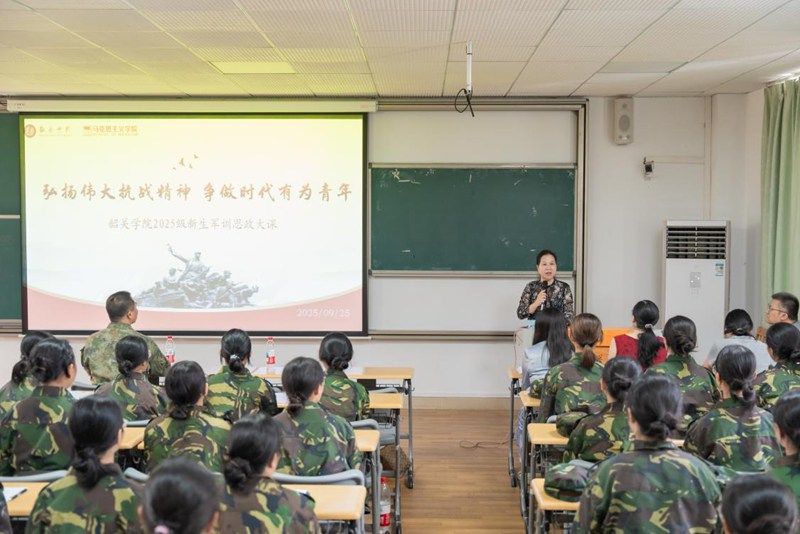 “八十年前,中华民族以血沃山河的壮举赢得民族独立;八十年后,新时代青年当以精神传承续写复兴华章。”马克思主义学院院长薛晓芳以历史纵深视角阐释了伟大抗战精神的时代价值。她指出,伟大抗战精神所蕴含的“天下兴亡、匹夫有责的家国情怀,视死如归、宁死不屈的民族气节,百折不挠、坚韧不拔的必胜信念”,勉励新生立大志、明大德、成大才,将伟大抗战精神转化为训练动力,把家国情怀升华为奋斗自觉,争做有理想、敢担当、能吃苦、肯奋斗的新时代好青年。