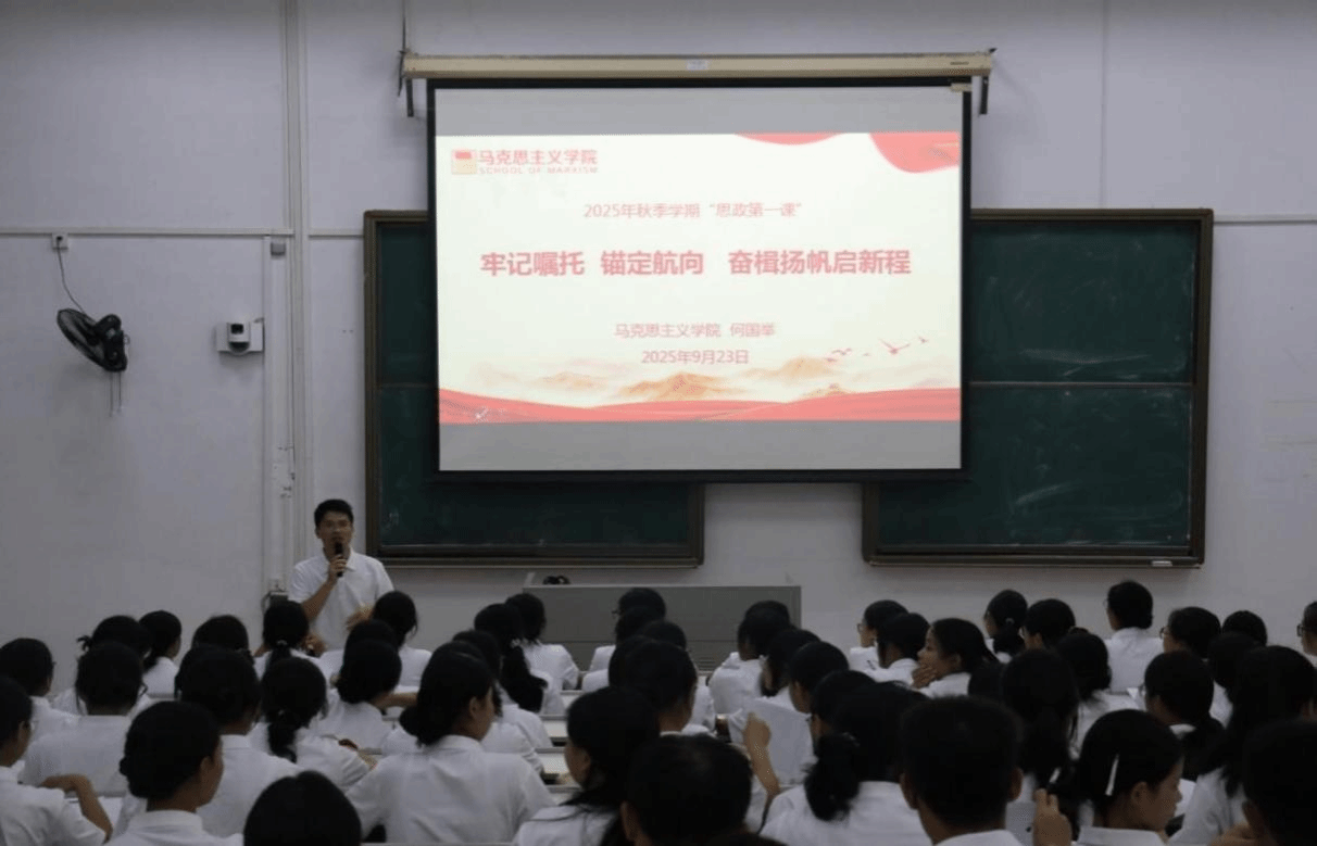 为引导新生更好地适应大学生活,帮助他们系好大学的“第一粒扣子”,9月23日晚,马克思主义学院2025年秋季学期“思政第一课”在善德楼B402举行。学院党委书记何国举以《牢记嘱托 锚定航向 奋楫扬帆启新程》为题,为全体新生授课。