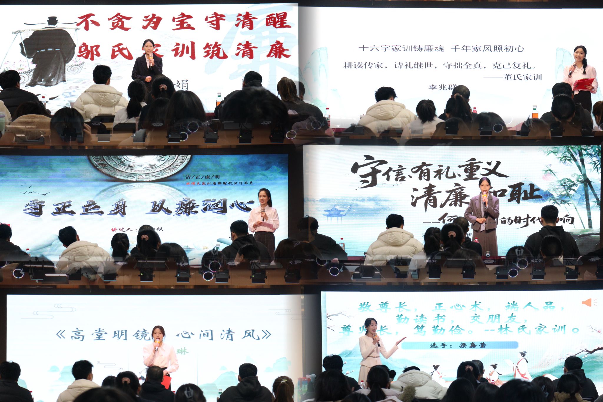 决赛现场气氛热烈,选手们紧扣“家训廉箴”主题,以鲜活的事例和朴实的语言,多角度分享自己对清廉家训的认知、对廉洁箴言的感悟、对风清气正的坚守。或引用家训,阐释清廉家风的丰富内涵;或立足专业,分享坚守诚信学风的切身体会;或展望未来,抒发为党育人、为国育才的青春理想。她们将个人成长与廉洁文化紧密串联,展现了韶关学院学子对清廉内涵的深刻理解和自觉践行,精彩的表现赢得了现场观众的阵阵掌声。
