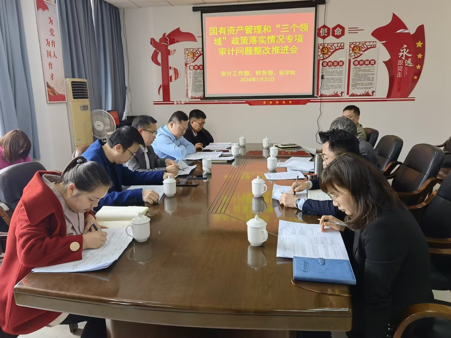 为落实省教育厅对学校国有资产管理和“三个领域”政策落实情况专项审计发现问题整改,3月20日下午,审计工作部、财务部、资产设备管理部、医学院、附属医院联合召开审计整改推进会。