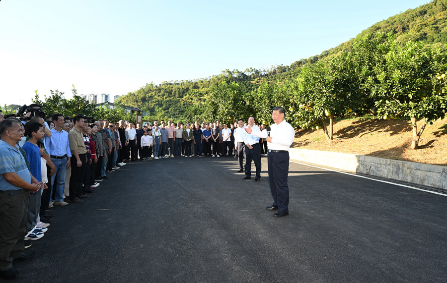 11月7日至8日,中共中央总书记、国家主席、中央军委主席习近平在广东考察。这是7日下午,习近平在梅州市梅县区雁洋镇南福金柚种植基地考察时,同果农和农技人员亲切交流。新华社记者 谢环驰 摄 金柚是梅州的特色农产品。正值收获季节,柚子园硕果累累。习近平来到雁洋镇南福金柚种植基地,在展示厅听取广东加大对革命老区支持力度、推进乡村全面振兴等情况汇报,察看柚子及其加工产品、文创产品。他走进果林,同果农和农技人员亲切交流。得知今年金柚喜获丰收、销路畅通,习近平十分高兴。他指出,发展乡村特色产业是推进乡村全面振兴的基础,要加强科技应用,推动农文旅融合,不断延伸产业链、增加附加值,带动更多农民群众增收致富。