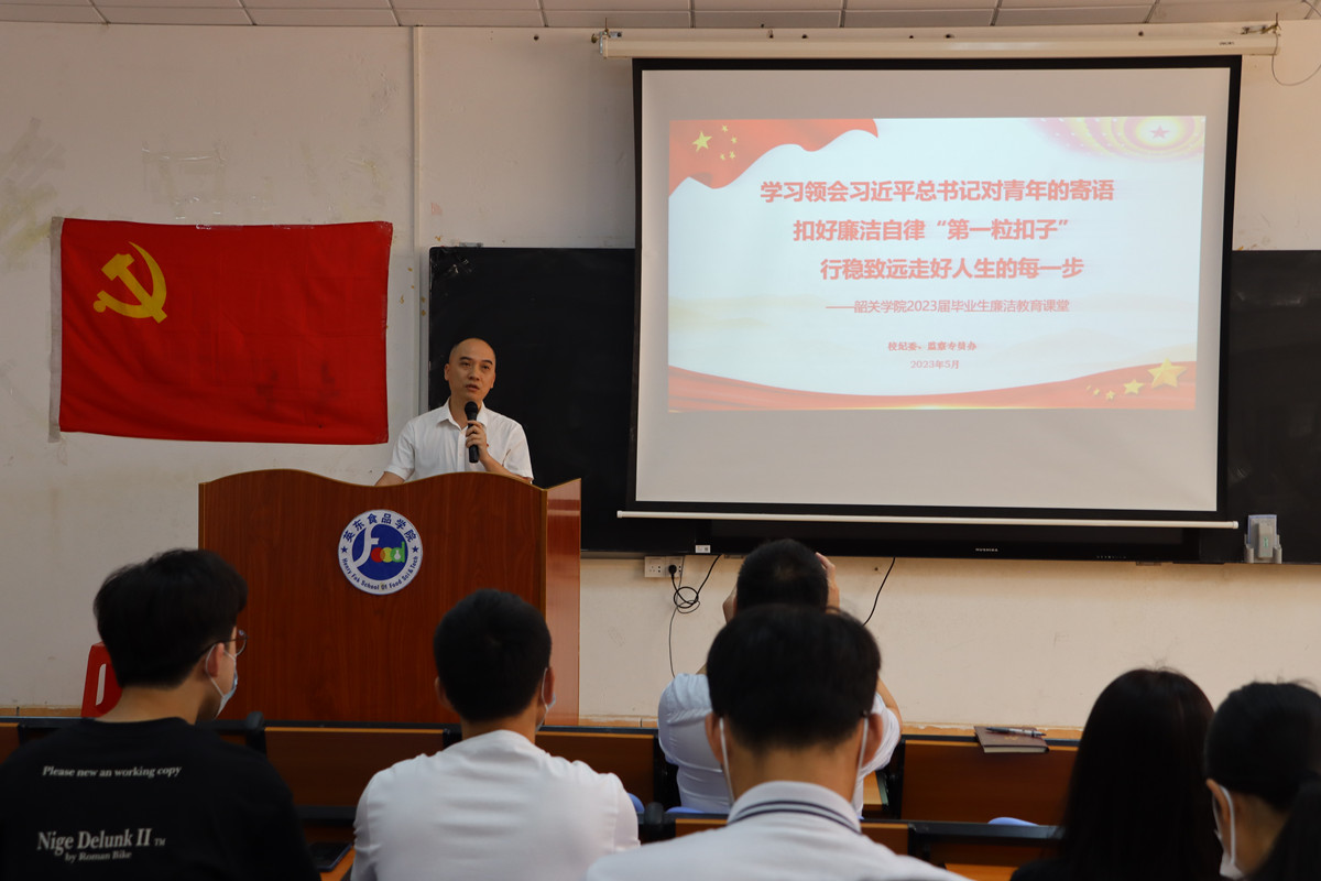 为了进一步推进廉洁教育“进课堂、进头脑”,引导学生自觉形成坚守底线、不越红线、心存敬畏、慎独慎微的廉洁自律观念,强化纪律意识和规矩意识,5月28日上午,食品学院在英东楼学术报告厅举行廉洁教育课堂。食品学院党委书记谷永芹、学工办老师和学生代表共计100余人参加学习,韶关学院发展规划部副部长戚鹏宇受邀主讲。