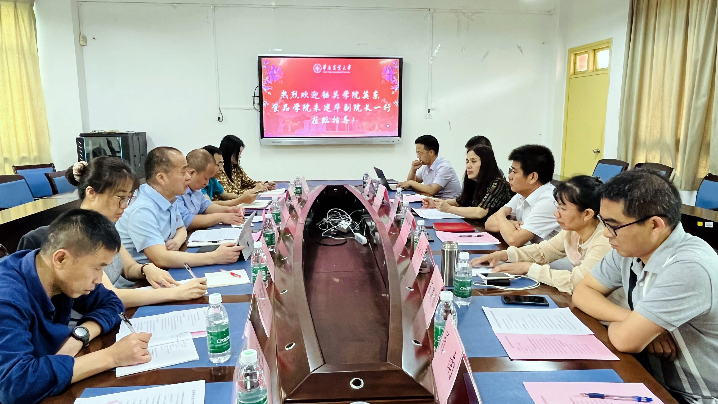 在华南农业大学食品学院,朱建华一行受到该院党委书记魏剑波、副院长钟青萍等领导的热情接待。会上,魏剑波对韶关学院英东食品学院一行的到来表示热烈欢迎,钟青萍介绍了华南农业大学食品学院的办学情况,并从师资队伍建设、教学成果、学生质量、科学研究四个方面介绍学院的建设成效。朱建华对华南农业大学食品学院一直以来的帮助与支持表示衷心的感谢,并汇报了英东食品学院近年来在学科课程建设、人才培养和科学研究等方面取得的成果。两院就行政管理、学科建设、专业及课程建设、实验室安全管理、人才培养及成效以及党建及学生工作等关注的问题,进行了深入的交流。