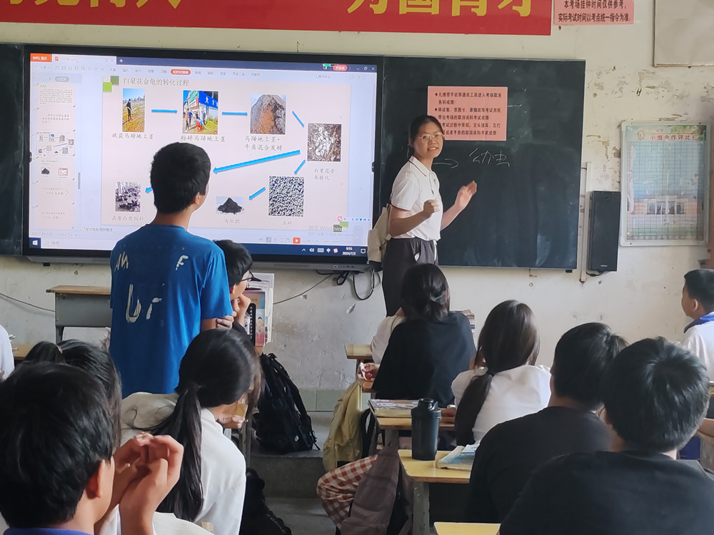 上午9时,实践团来到了南雄市珠玑镇珠玑中学。团队成员给八年级3班的同学们讲解了关于马蹄育种技术创新、如何处理大量马蹄地上茎的废弃物、白星花金龟成长和转化产品的相关知识,科普课程生动有趣,给同学们留下深刻的印象,同学们认真听讲、积极参与互动。科普讲解后,实践团对学校的留守儿童进行慰问,将文具赠予留守儿童,并且还互换交流方式,进行暖心交流。