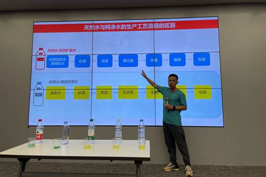 7月7日,实践队来到了农夫山泉广东万绿湖饮料有限公司。肖仔君副院长为学生们上了一堂生动的饮用水科普知识专题课,详细介绍了地球水资源的现状、纯净水的生产工艺流程,以及农夫山泉如何通过科技创新实现产品的高品质。