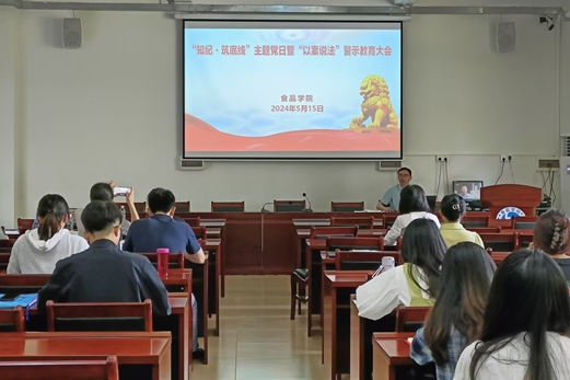 根据学校和学院党纪学习教育工作部署,近日,食品学院开展了“知纪·筑底线”主题党日暨“以案说法”警示教育大会。会上,党委书记黄四明带头讲授党纪学习教育专题党课。黄四明重点围绕《中国共产党纪律处分条例》总则及修订的主要背景开展授课,全面梳理了《中国共产党纪律处分条例》的修订历程,深刻阐释了开展党纪学习教育的重要意义。他强调,全院党员干部要学纪在前、知纪在全、明纪在心、守纪在行,真正把铁的纪律转为自觉行动,为高质量推动学院建设提供坚强的纪律保证。会上组织全体师生党员认真观看了《持续发力纵深推进》反腐电视专题片,使党员干部进一步受警醒、明底线、知敬畏,形成正风肃纪的良好氛围。