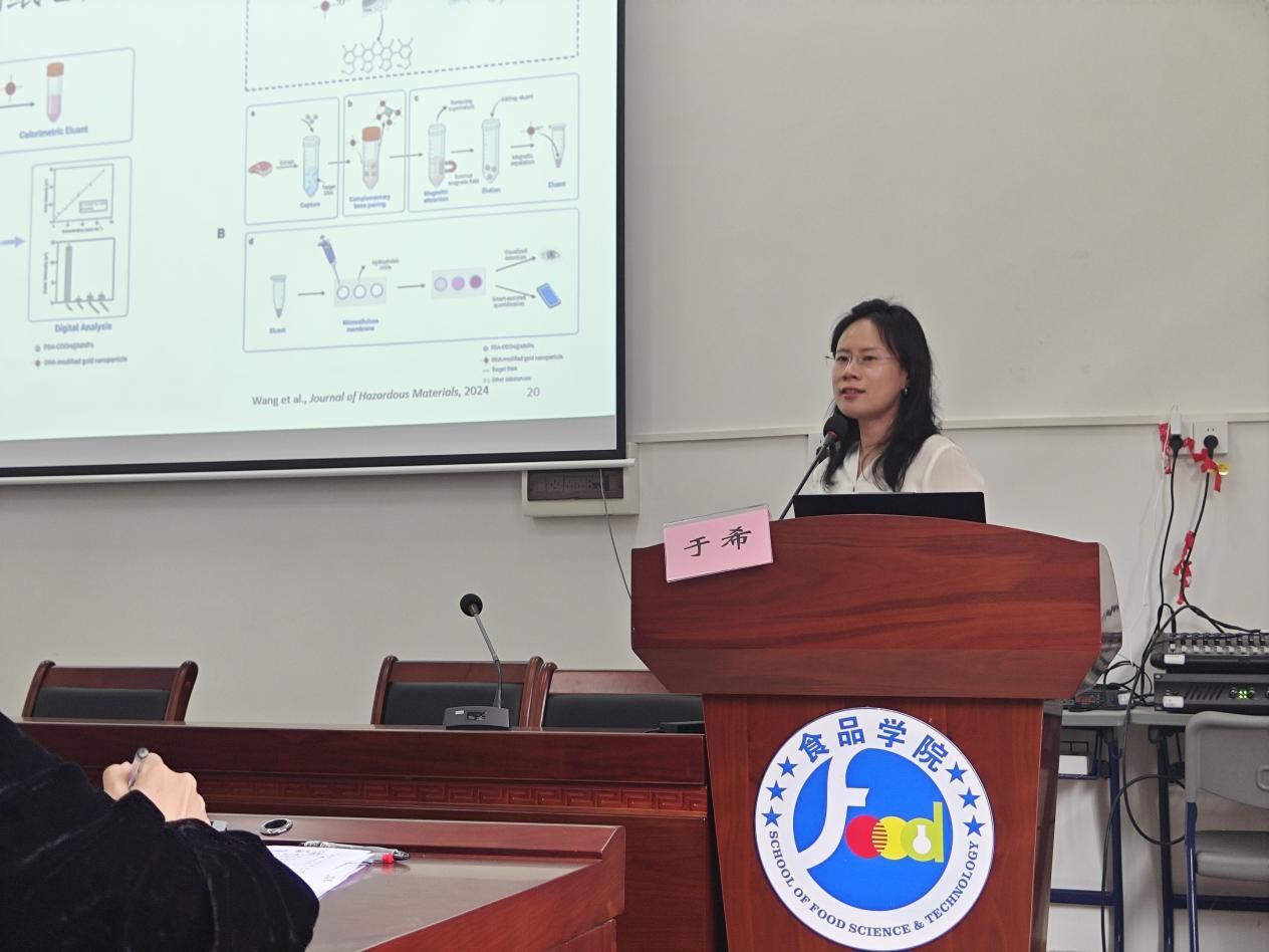 于希助理教授主讲“磁性纳米技术在复杂食品分析中的应用”学术报告,介绍了其团队近年来制备了各种多功能的磁性纳米材料,并利用它们开展各类食品复杂体系分析工作,包括农残分析、霉菌毒素检测、食品真实性检验等。