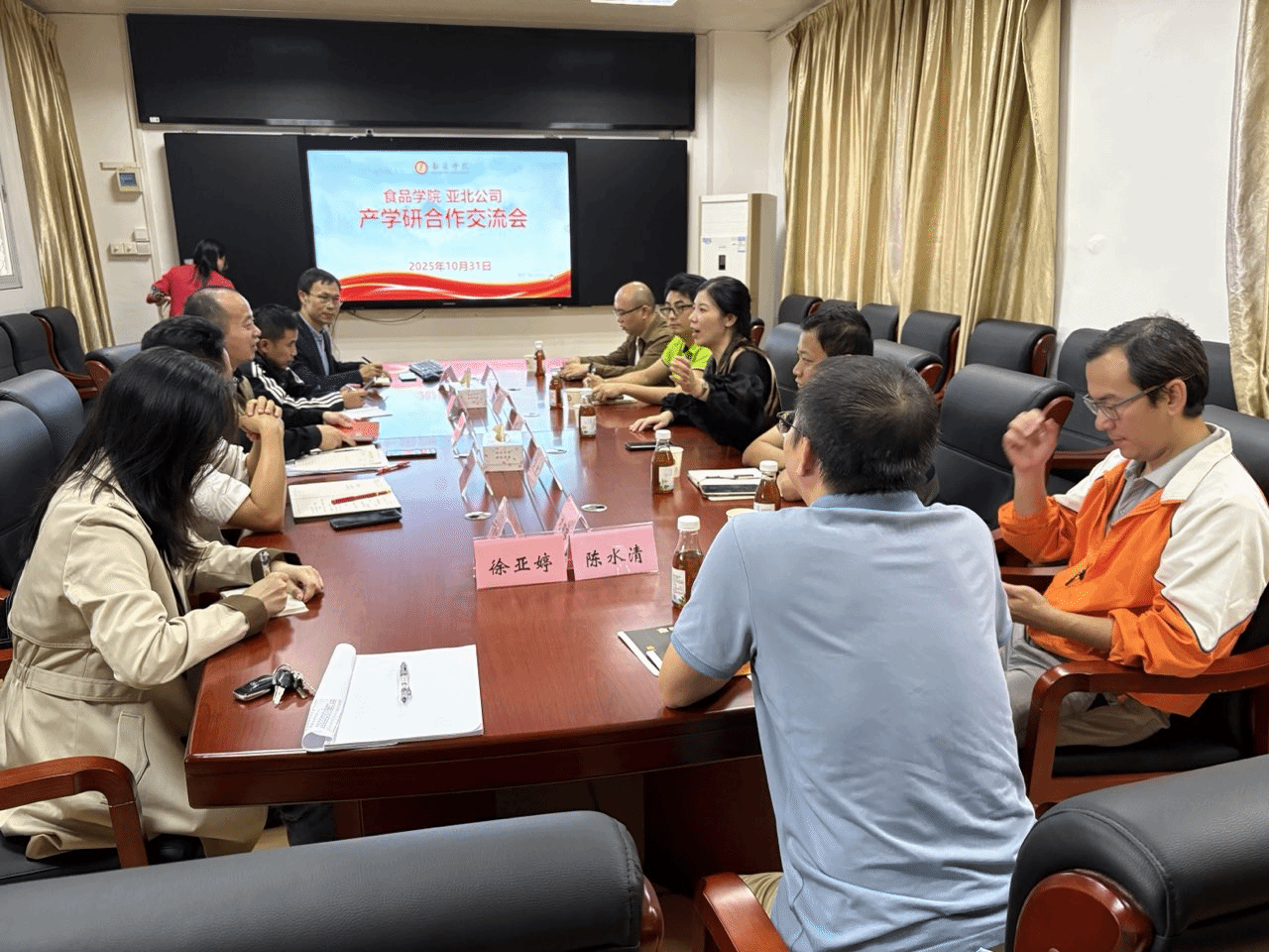 为持续推进研产教融合,10月31日,广东亚北农副产品有限公司(以下简称“广东亚北”)-韶关学院食品学院研产教融合座谈会在英东楼B212会议室举行。粤港澳大湾区“菜篮子”产品韶关配送中心(亚北冷链)品牌中心负责人周姗、犇牛农业发展有限公司总经理梁文明、广东岭南食品工业设计研究院陈水清等一行应邀到访食品学院。会议由食品学院院长朱建华主持,副院长肖仔君、院长助理廖彩虎、食品营养教研室主任刘永吉等教师代表参加了本次会议。