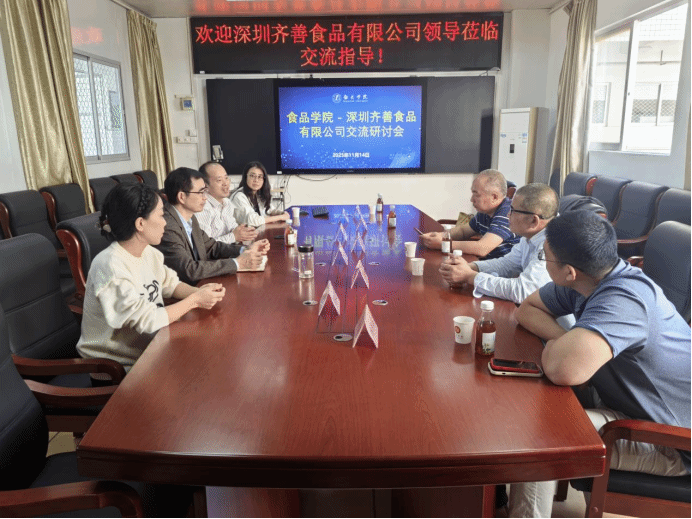 2025年11月14日,深圳齐善食品有限公司总裁普宏钢一行到访韶关学院食品学院(英东食品学院),开展应用型人才产教融合专项调研交流。食品学院党委书记黄四明、院长朱建华、副院长张霞、院长助理康林芝热情接待,双方围绕企业发展、产品创新及合作前景等议题进行交流,共话产教融合新路径。