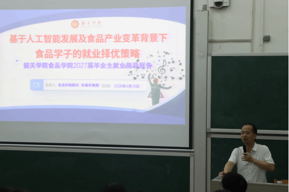 4月13日晚,食品学院在南2-D402教学楼召开2026年度粤北现代食品产业学院暨食品类专业“五位一体”卓越人才培养计划特色班遴选及深化实践动员大会,同步举办《基于人工智能发展及食品产业变革背景下食品学子的就业择优策略》就业指导报告。本次活动是学院落实立德树人根本任务,推进食品学科优势转化为人才培养效能、对接粤北现代食品产业人才需求的重要举措,面向2023级全体食品类专业学生开展,学院领导班子、各系主任、2023级各班班主任及辅导员全程参会。