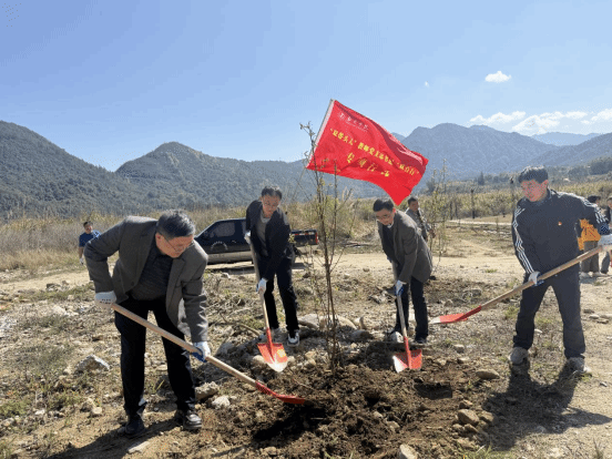 抵达乳源瑶族自治县西京古道植树点后,党员教师们迅速行动,以分组协作的方式开展义务植树活动。挖坑、扶苗、填土、浇水,每一个环节都一丝不苟、配合默契,亲手种下桃树、李树、桂花树等适应当地气候的乡土树种,并为新苗悬挂“党员责任树”标识牌。短短半小时,30棵新苗整齐挺立在西京古道旁,为这片底蕴深厚的古驿道增添了盎然绿意。此次植树行动既是支部践行生态文明理念的具体举措,更是以“双百行”专项行动为载体,助力乳源生态环境改善、打造绿色乡村的实际行动,让生态文明理念在躬身实践中落地生根。