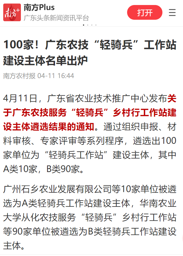 广州石乡农业发展有限公司等10家单位被遴选为A类轻骑兵工作站建设主体,华南农业大学从化农技服务“轻骑兵”乡村行工作站等90家单位被遴选为B类轻骑兵工作站建设主体。