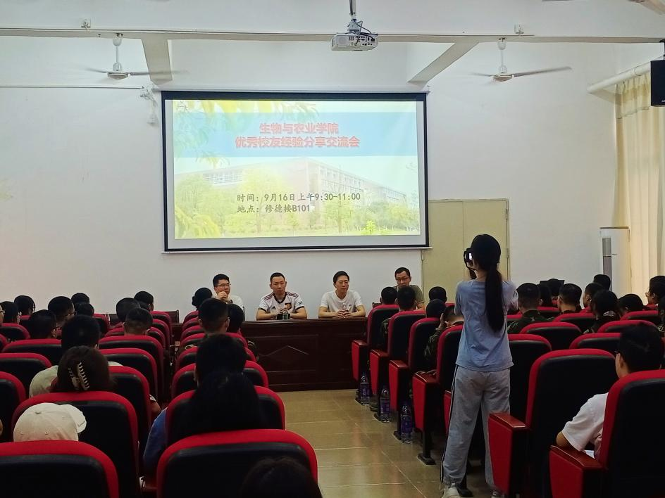 9月16日,生物与农业学院在修德楼B101举办校友经验分享交流会,邀请2013届毕业生李威达、包赖翔、何翔三位校友做经验分享。我院土地资源管理系系主任张宇鹏、相关教师以及110名学生参加。