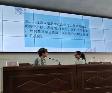 活动现场:参赛选手根据所抽到的情景题目,细致刨析问题,耐心解决困惑,与助演们展开演绎。