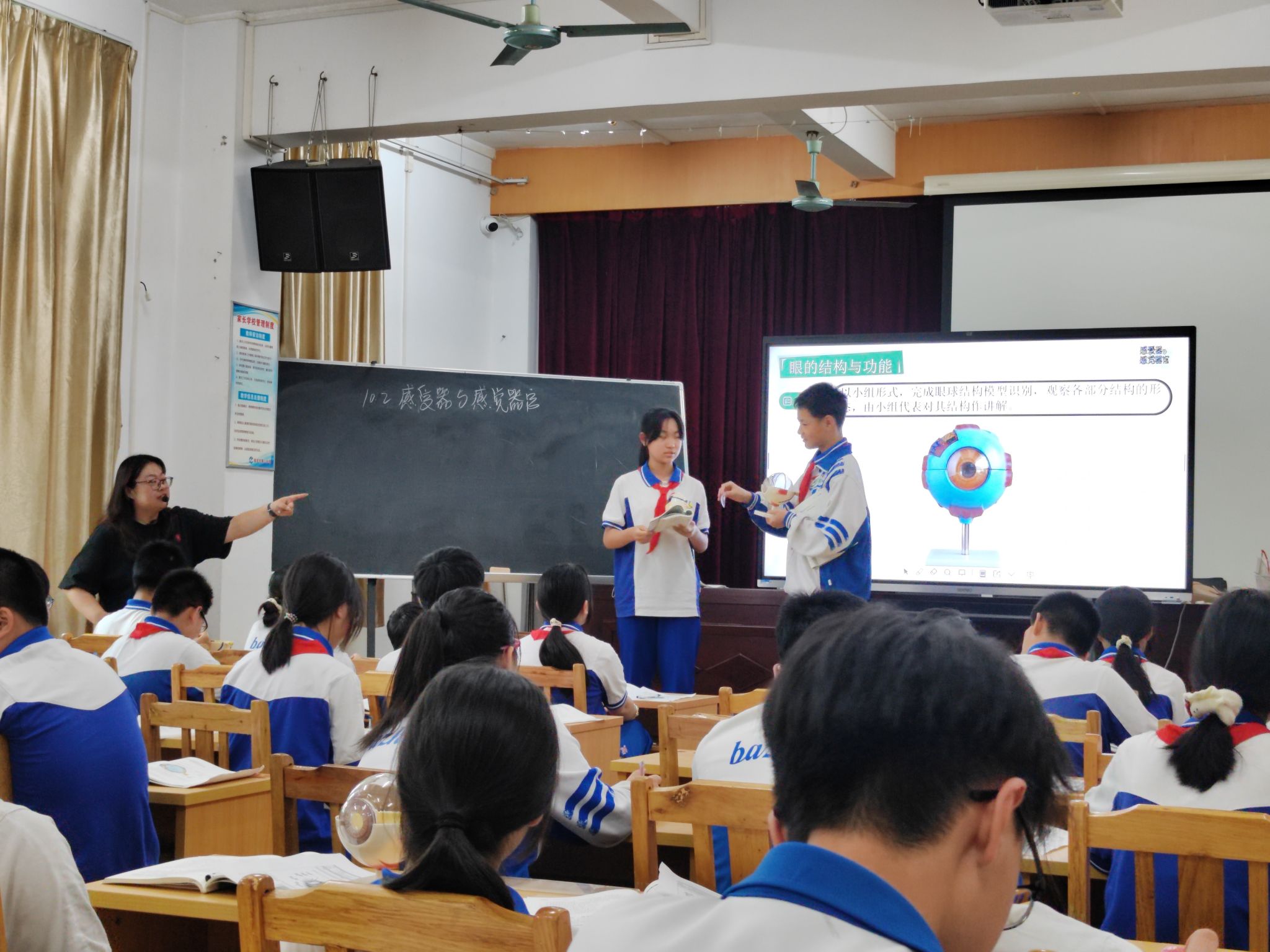 紧接着,蓝欣老师带领七 11 班的同学们带来《感受器和感觉器官 — 眼与视觉》的教学展示。蓝老师运用问题串,为学生精心设计七个学习任务,引导学生逐步深入探索眼与视觉的知识。