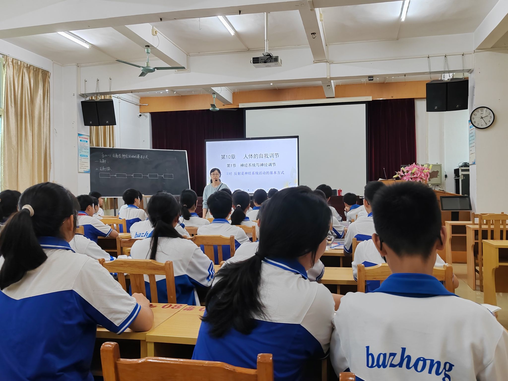 参观结束,同学们前往行政楼五楼录播室,开启了精彩纷呈的听课评课环节。首先登场的是陈永芳老师,她带领七 3 班的同学们深入学习《反射是神经活动的基本方式》。整堂课中,陈永芳老师十分注重与学生的互动,多次运用真实情景教学,将抽象的生物学知识转化为具体可感的内容,为同学们呈现了一堂极具参考价值的中学生物教学课。